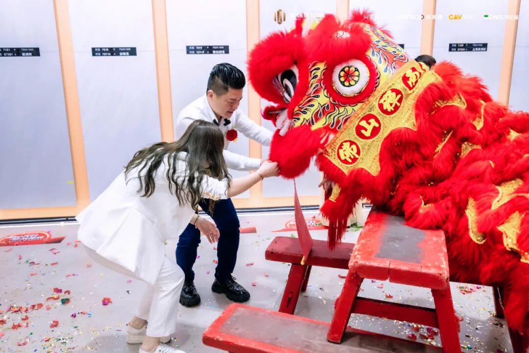 随着锣鼓声响,瑞狮欢腾跳跃在新强盛企业展厅,唤醒的狮子登高采青,由新强盛企业董事长许国强先生和新强盛企业营销总经理周嘉宜共同进行采青仪式,寓意着新强盛企业未来红红火火,财运亨通,事业兴旺,财源滚滚!同时也为新强盛企业带来鹏程万里、前程似锦的美好祝愿!