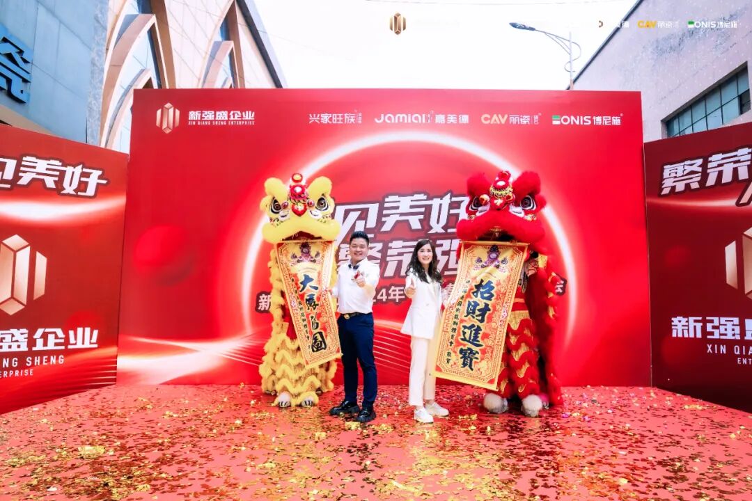 在四方宾朋,八方来客的共同见证下,由新强盛企业董事长许国强与新强盛企业营销总经理周嘉宜女士,一同为祥狮点睛,寓意新强盛企业生意蒸蒸日上!